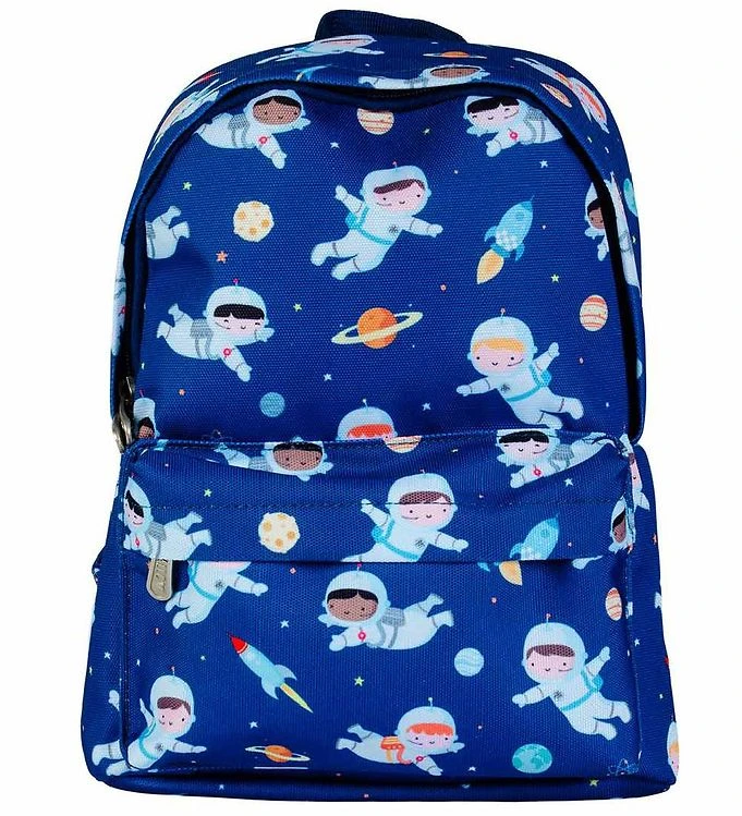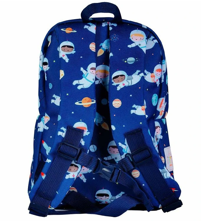 Mooi A Little Lovely Company kleuterrugzak in navy met een allover print van schattige astronauten en planeten. Aan de zijkant bevindt zich een wit applicatie met de naam van het merk.