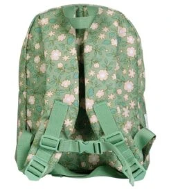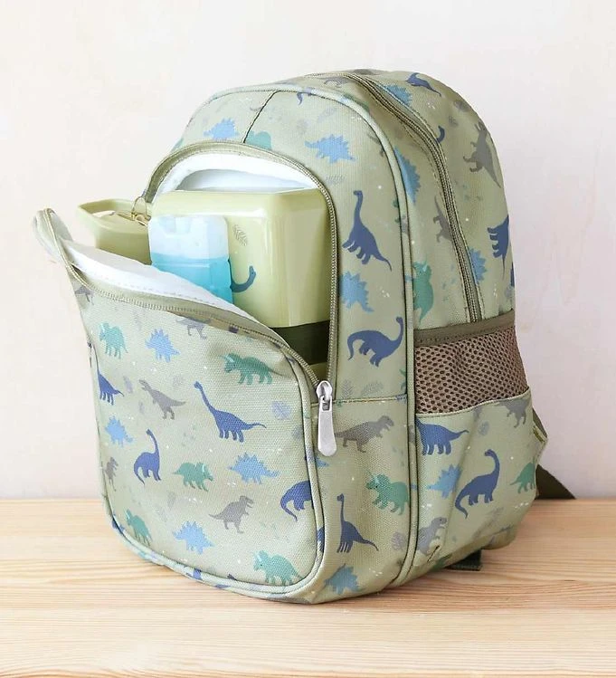 Mooi A Little Lovely Company kleuterrugzak in de groen met een allover print van stoere dino’s. Aan de zijkant bevindt zich een wit applicatie met de naam van het merk.