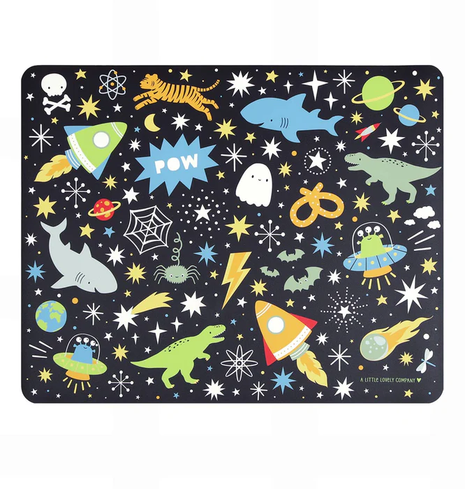 De zwarte vinyl placemat met raketten, planeten en sterren is ideaal voor kinderen. De placemat is makkelijk schoon te houden en heeft een royaal formaat. Daardoor biedt het alle ruimte om er comfortabel van te eten of om op te knutselen. Dankzij de antislip laag blijft de placemat netjes op zijn plek liggen.