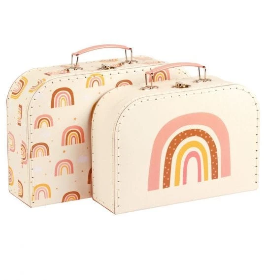 Deze set van twee koffertjes staat schattig op de baby- of kinderkamer, is leuk om mee te spelen en handig voor het opbergen van speelgoed. De koffertjes komen in twee verschillende formaten en zijn gemaakt van stevig karton met polyester stiksels. Zowel het grote als kleine koffertje hebben een metalen handgreep en gesp waardoor kleine schatten bewaard zullen blijven.